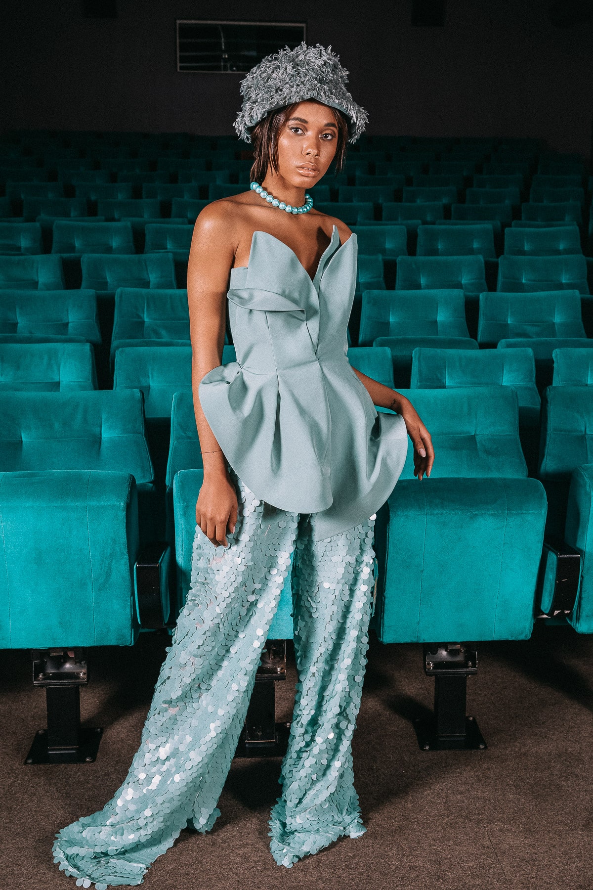 Dviejų dalių kostiumas – korsetas ir kelnės. Kostiumas pasiūtas iš Itališko vilnos ir poliesterio audinio. Dėl šių savybių puikiai atrodo ir nesiglamžo. Korseto viduje yra sagos, kurios padeda, poreikiui esant, korsetą sumažinti. Kelnių ilgis pritaikomas individualiai. Kostiumas ypatingai gerai dailina siluetą ir sukuria smėlio laikrodžio figūros iliuziją.