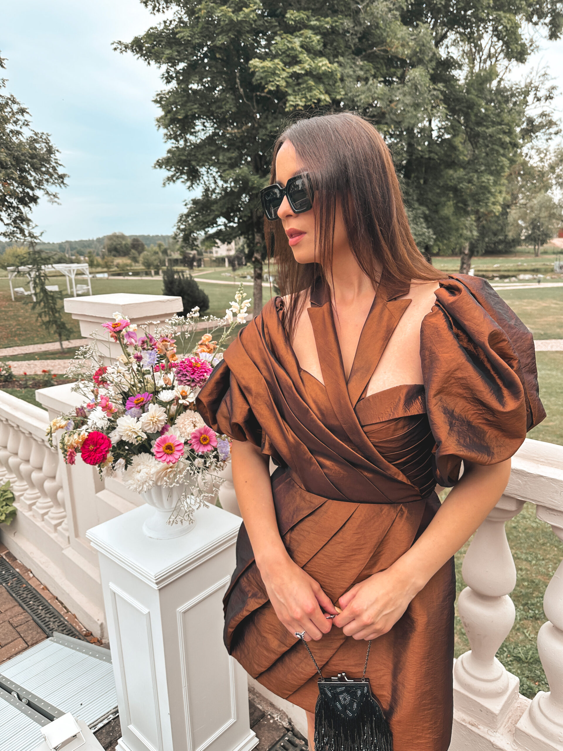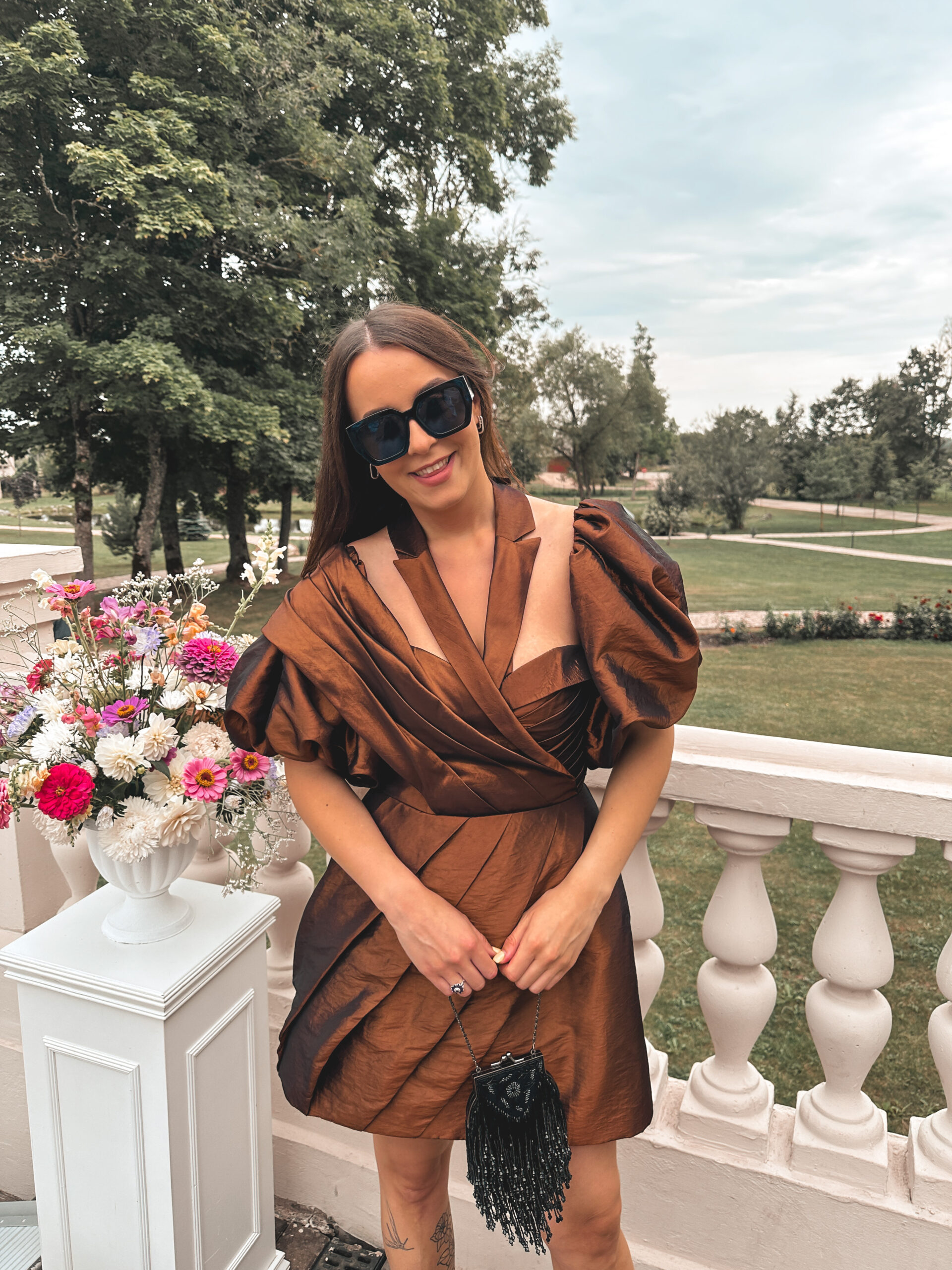 Kokteilinė suknelė pasiūta iš taftos audinio, kuris nesiglamžo ir suteikia formą. Viršus korsetinis, visa suknelė standi. Siluetas savo savybėmis dailina moters figūrą.