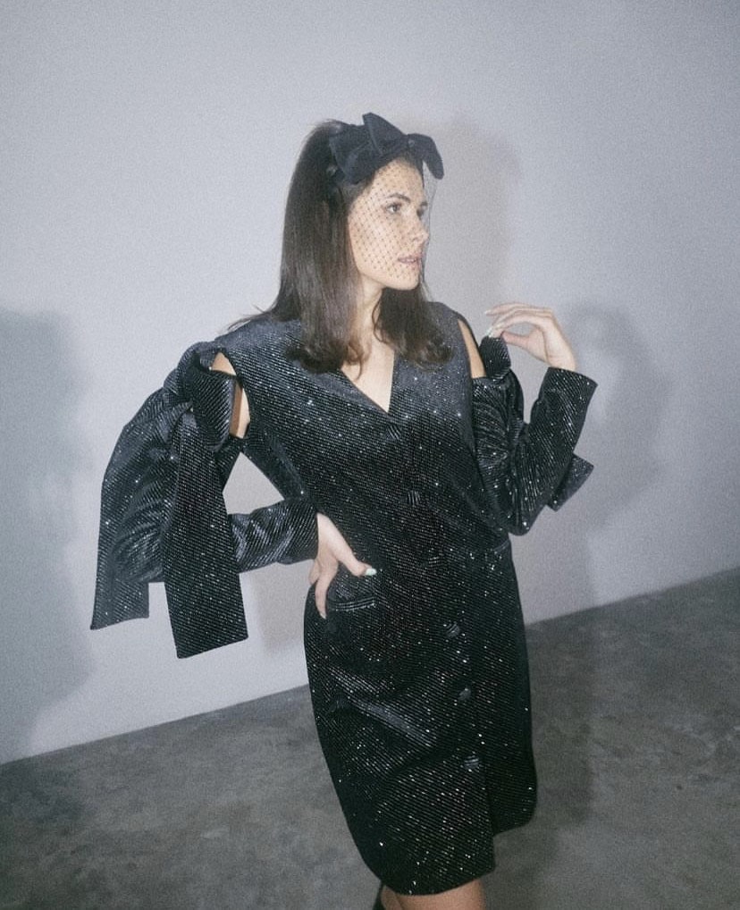 Suknelė įliemenuota, bet išlaikanti tiesų švarko siluetą. Rankovės su netikėtomis detalėmis. Galima dėvėti, kaip suknelę arba atsisegus, kaip ilgą švarką prie kelnių.